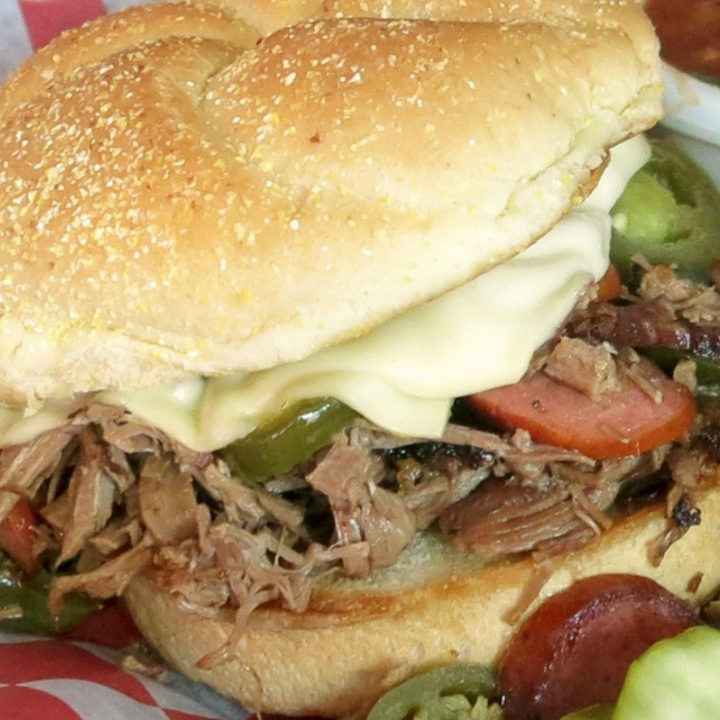 We take sliced brisket, sliced homemade jalapeno cheddar sausage, grilled jalapeños and melted Swiss cheese and pile it high on a toasty bun. Served with one side dish & pickles.