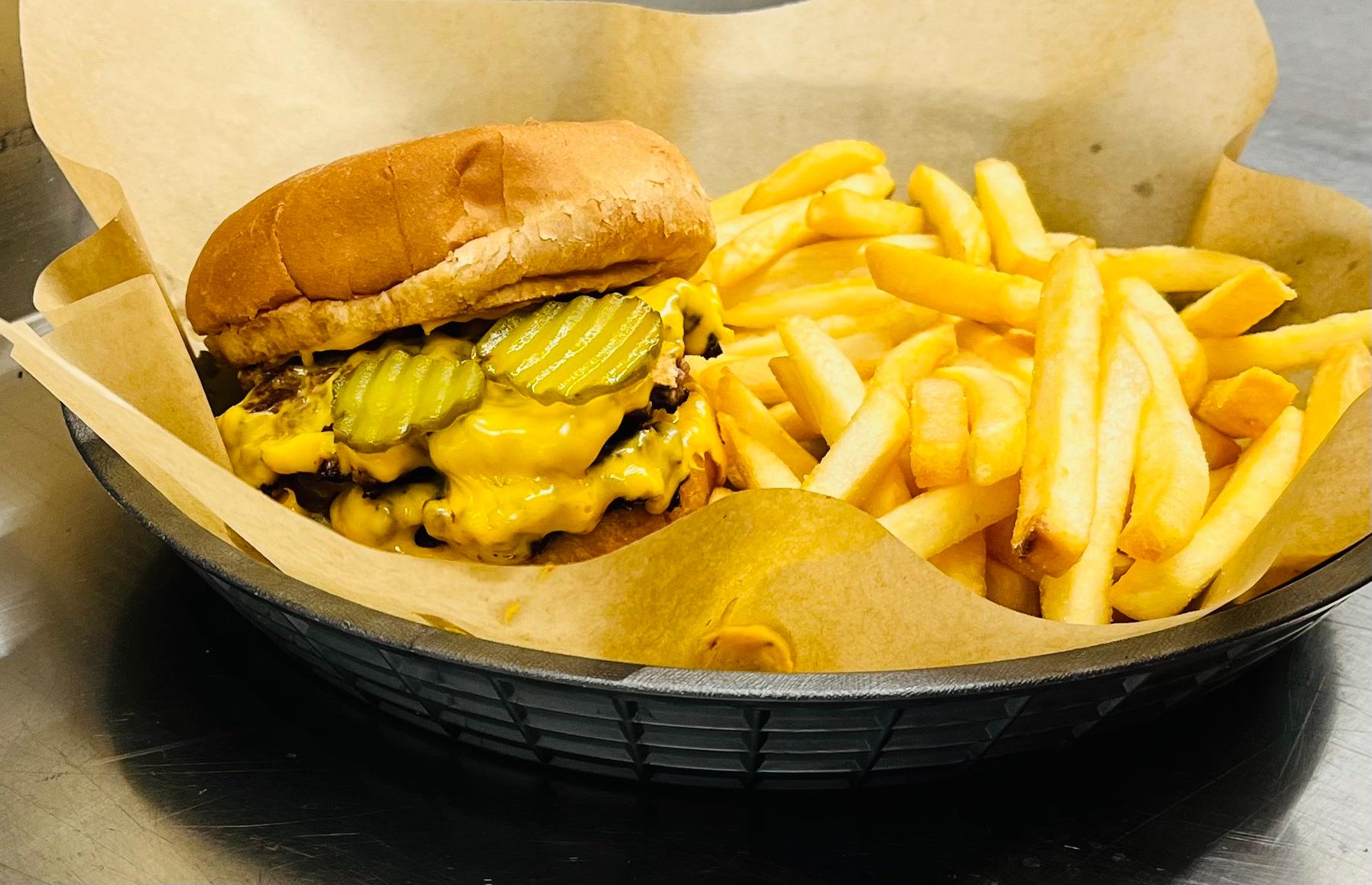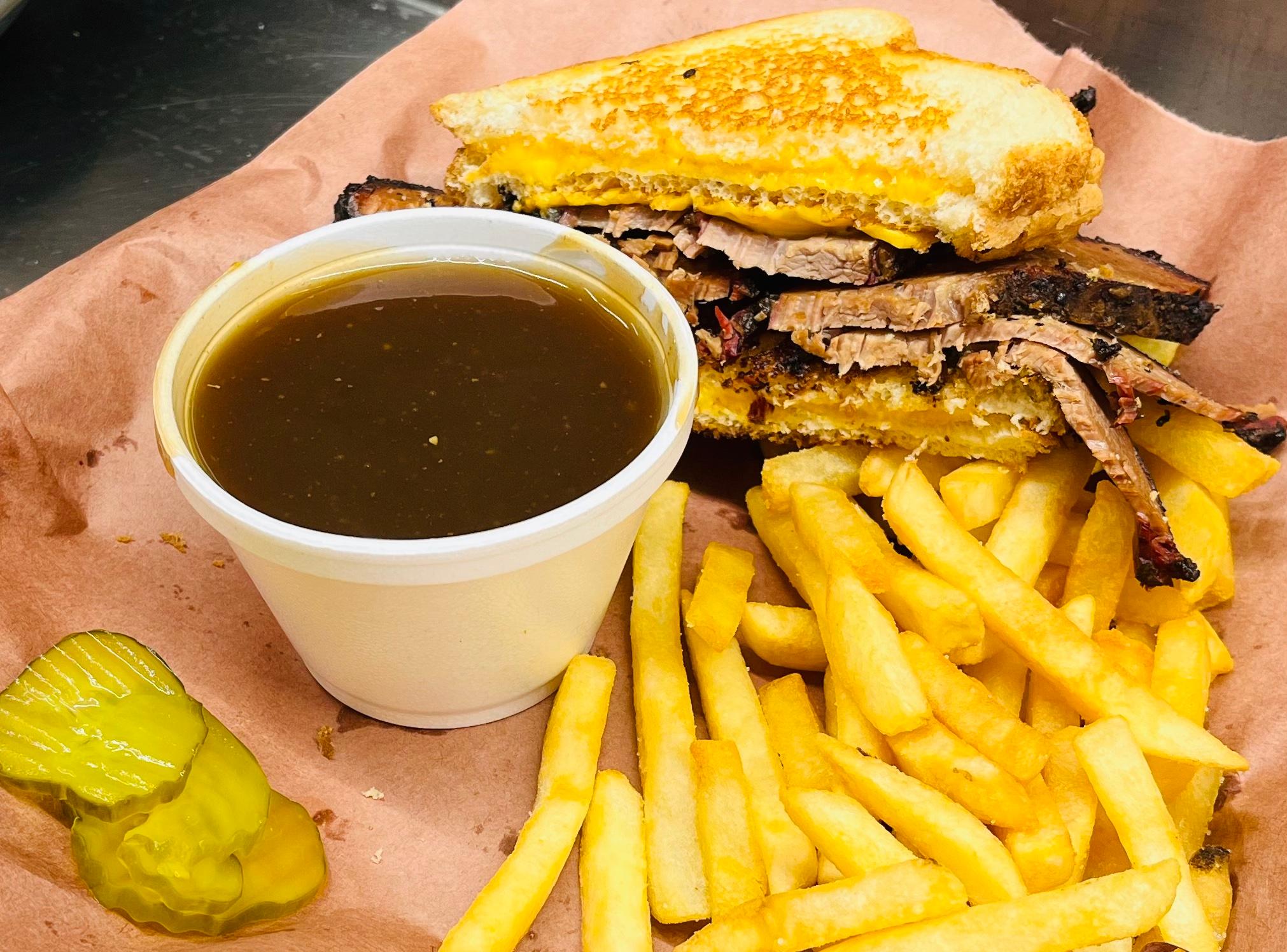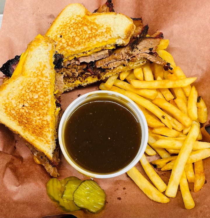 This is our most popular sandwich! It starts with two grilled cheese sandwiches as the bun. We add sliced brisket and one more slice of American cheese. It is served with a side of brown gravy for dipping. It comes with one side & pickles.