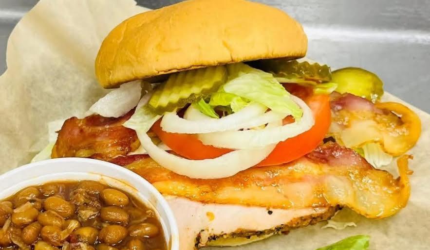 Five ounces of our smoked & seasoned turkey breast that is sliced to order and served up on a toasted bun. Served with your choice of one side dish & pickles.