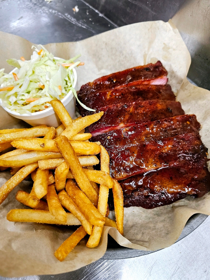 Three of our award winning ribs served with a slice of bread and one side dish.